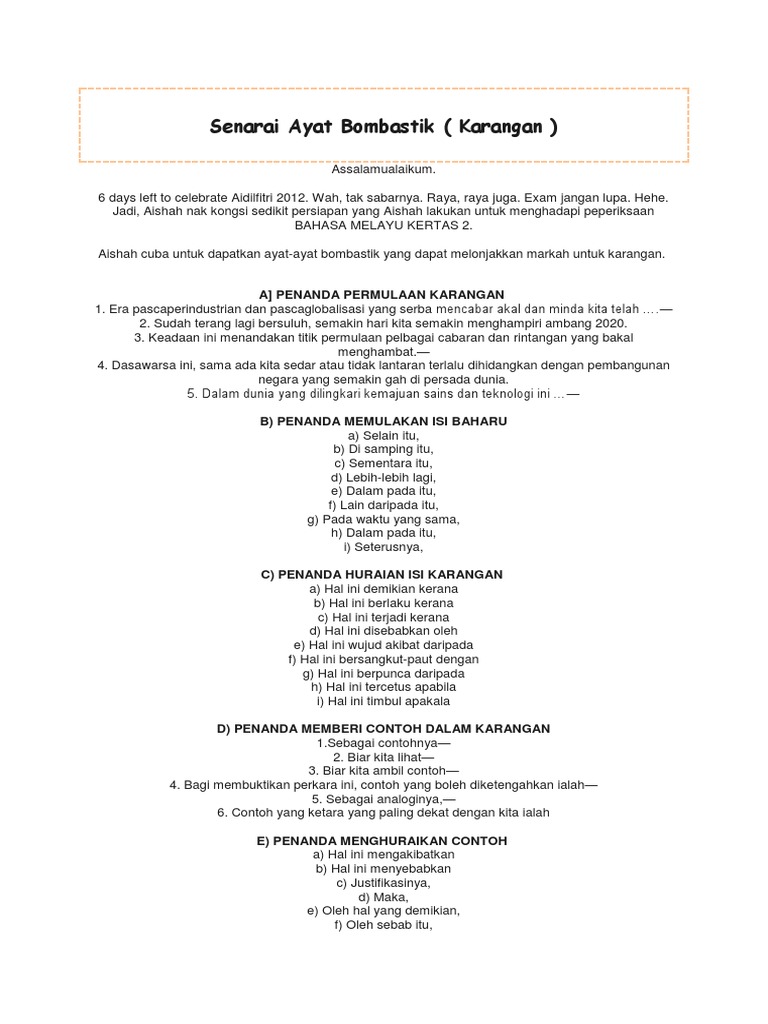 Bakar bin Iqbal Sadiq May 13 2015 at 139 AM. AYAT PERKATAAN BOMBASTIK DI DALAM KARANGAN AYATPERKATAN BERIKUT BOLEH DIGUNAKAN DI DALAM PENULISAN UNTUK MERANGSANG ATAU MENARIKA PERHATIAN PEMERIKSA KERTASPEMBACA A 1.